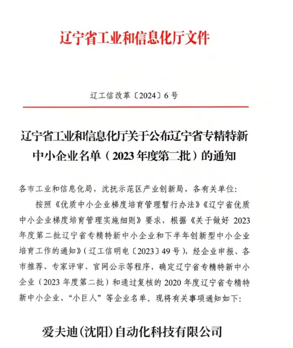愛(ài)夫迪(沈陽(yáng))自動(dòng)化科技有限公司榮獲 2023年度“遼寧省專精特新中小企業(yè)稱號(hào)”