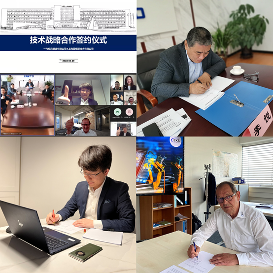2022年4月29日,翌耀科技旗下企業 - 上海翌楷斯技術有限公司(下簡稱翌楷斯公司)宣布與一汽模具制造有限公司(下簡稱一汽模具公司)達成戰略合作,雙方于今日簽署協議,將共同依托虛擬調試平臺進行數字工廠的技術開發,助力國內汽車生產企業提升生產線質量和調試效率,合作打造高效的數字化生態系統,引領國內汽車產業智能轉型升級。受疫情影響,本次簽約儀式在中國上海、中國長春、德國魏加騰以視頻會議的方式進行,一汽模具公司副總經理李悅,總經理助理都韌剛,營銷中心總經理董智超,翌楷斯公司總經理吳敏,銷售副總監程鵬,德國EKS總經理約瑟夫穆勒以線上形式出席簽約儀式。